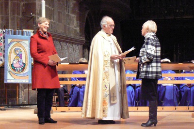| Angela Klabou was reaffirmed as the Diocese of Chester Mothers' Union President by The Bishop of Chester, The Rt Revd Dr Peter Forster on Saturday 19th January at Chester Cathedral. She was presented by the Bishop's wife and Mothers' Union Ex-officio Vice President Elisabeth Forster. | Following the service Angela is pictured with Provincial President Barbara Taylor and Manchester Diocesan President Catherine Hilton. |